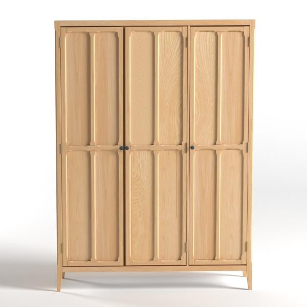 L'armoire 3 portes, Eugénie. Esprit maison de famille pour cette gamme de meubles de rangement qui associe sobriété des lignes et originalité du travail de découpes, proposée en version gris clair ou coloris chêne.