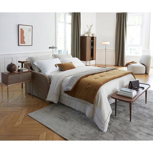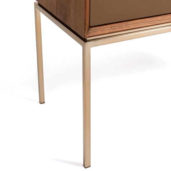 Minimaliste et sophistiquée. Des adjectifs qui caractérisent parfaitement l’armoire Delina. Un piètement métal tout en finesse couleur moka, un cadre en noyer, des portes recouvertes de cuir véritable et un aménagement intérieur fonctionnel…