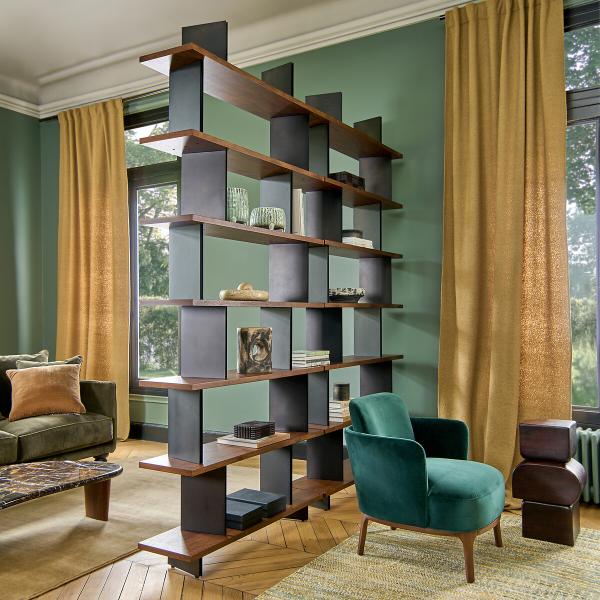 Sculpturale et modulable, Laos est une unité de bibliothèque qui se prête à de nombreuses compositions. En configuration linéaire le long d’un mur, les bibliothèques en accumulation forment un tableau mural.Placées au centre d’une pièce, elles agissent comme une séparation légère entre les espaces, laissant passer la lumière. Positionnées dans un angle, elles créent un coin intime, plus cosy. Les éléments verticaux en métal apportent une rupture à la linéarité des étagères noyer. Un design interne signé AMPM.