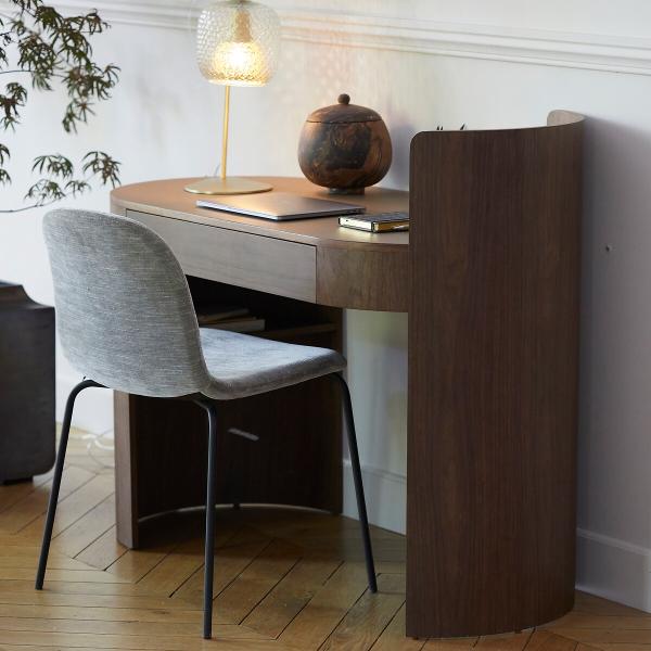 La structure en noyer FSC® et le plateau recouvert de cuir véritable reflètent une idée d’esthétisme responsable et de fonctionnalité. Un bureau signé AMPM.