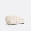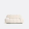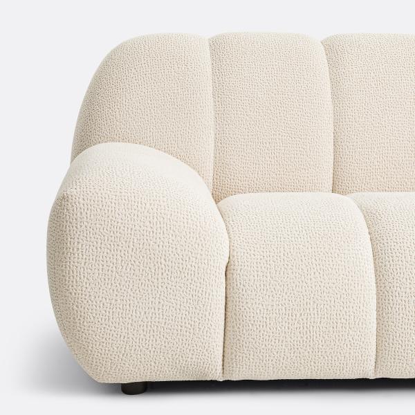 ""Le canapé Nuria s’inspire des codes emblématiques des années 70 avec son assise basse posée à même le sol et son allure généreusement moelleuse. Un jeu de coutures dessine une alternance de volumes rebondis et de courbes, évoquant un effet de boudins, qui rappelle l’esthétique enveloppante et le confort douillet des intérieurs seventies.""
