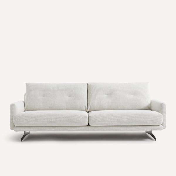 Ligne contemporaine et élégante. Aérien grâce à son piètement acier, Delicato est un canapé dont le trait distinctif réside dans l'originalité de son profil : ses accoudoirs sont en retrait sur l’avant, et découpés à l’arrière.Ses coussins capitonnés invitent au bien-être. Ce canapé fabriqué en Italie et signé AMPM donne du caractère à l'espace qui l'entoure.