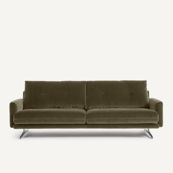 Ligne contemporaine et élégante. Aérien grâce à son piètement métal, Delicato est un canapé dont le trait distinctif réside dans l'originalité de son profil : ses accoudoirs sont en retrait sur l’avant, et découpés à l’arrière.Ses coussins capitonnés invitent au bien-être. Ce canapé fabriqué en Italie et signé AMPM donne du caractère à l'espace qui l'entoure.