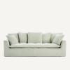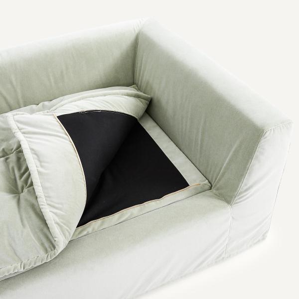 - Dossier (4 coussins pour le 3 places, 5 coussins pour le 4 places) : plumes d’oie, fibre polyester et flocons de polyuréthane