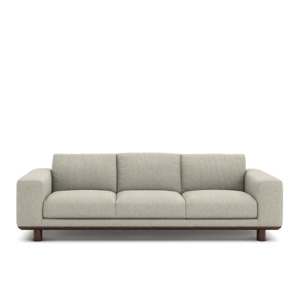 Larges accoudoirs, proportions généreuses, Cerea est un éloge de la simplicité et de la sobriété. Sa particularité : il est rehaussé du sol par une base en bois chanfreiné et des pieds en bois travaillés en demi-lune.