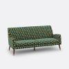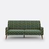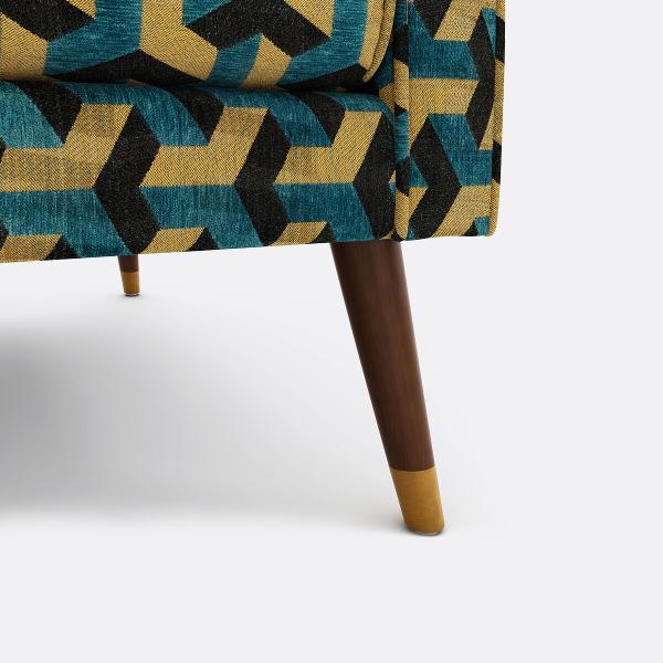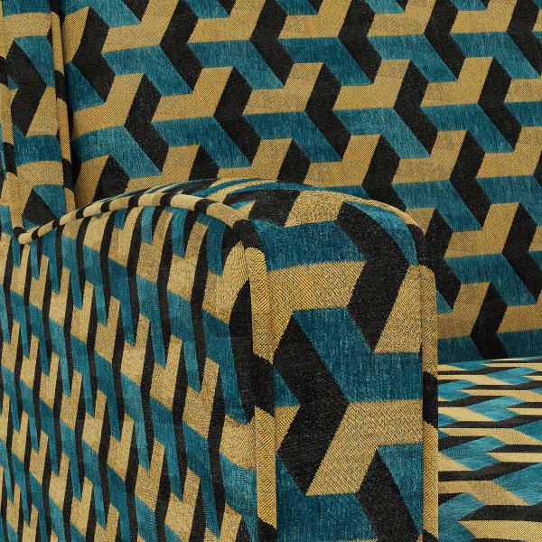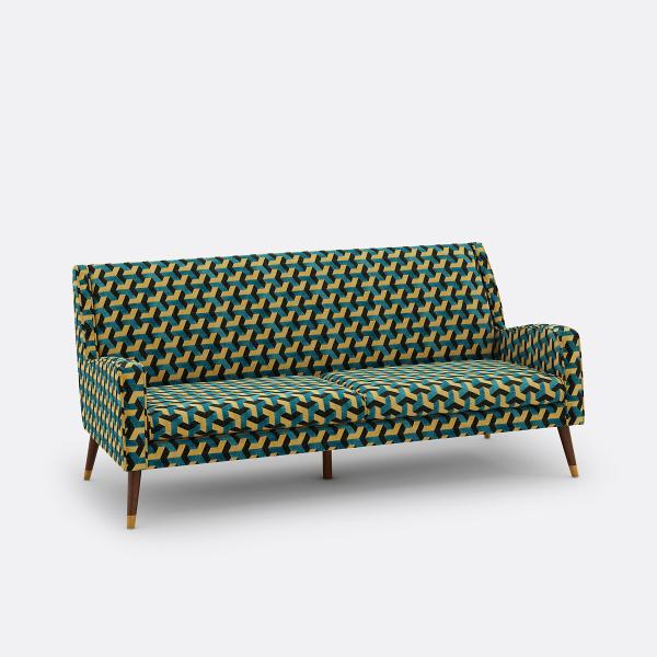 Un canapé à l?assise soulignée par des lignes dynamiques, un brodé géométrique gai et souligné par un passepoil contrastant.