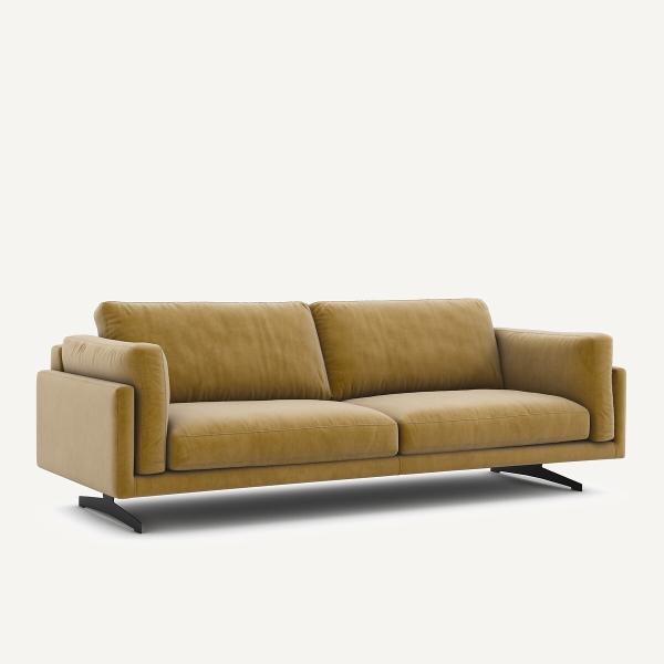 Le canapé velours César se caractérise par une ligne contemporaine, intemporelle, simple et élégante. Fabrication ItalienneSon coussin se dépose délicatement sur l'accoudoir et son garnissage généreux offre une grande expérience de confort. Les belles proportions, l'esthétique légère et épurée de ce canapé sont soulignés par deux pieds transversaux ce qui lui donnent l’impression de flotter dans l’air.