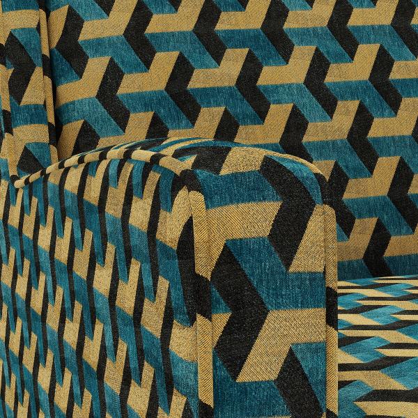 - Un canapé à l?assise soulignée par des lignes dynamiques, un brodé géométrique gai et souligné par un passepoil contrastant