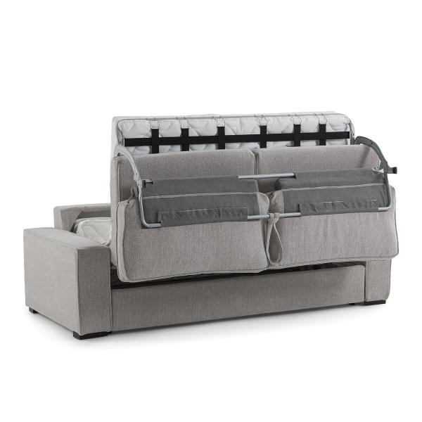 Grâce au système couchage express, le canapé lit se déplie en un clin d'œil (à l'aide d'une petite poignée derrière les coussins de dossier), sans effort et sans enlever les coussins.