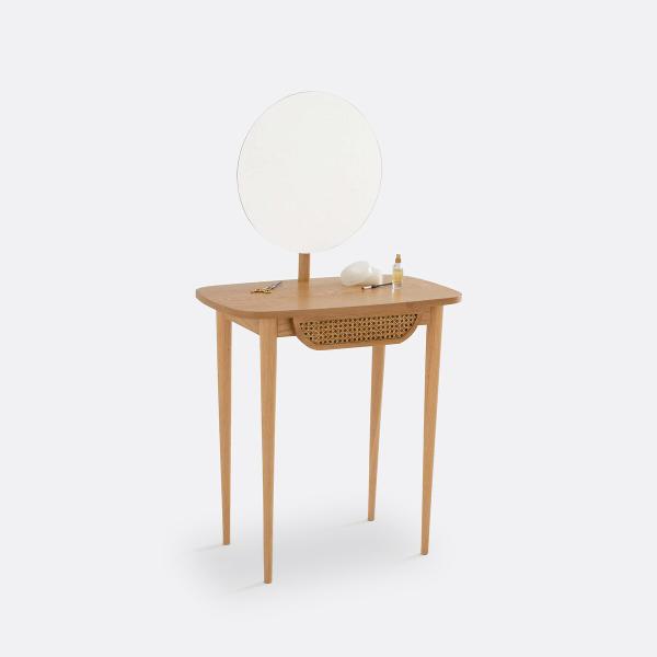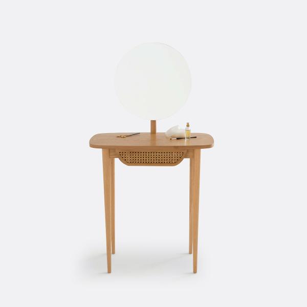 La coiffeuse Buisseau. Son esprit rétro tendance et sa ligne féminine vous séduiront. Réalisée en bois et cannage de rotin, la coiffeuse Buisseau apporte sa touche chic et naturelle à votre chambre.