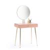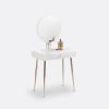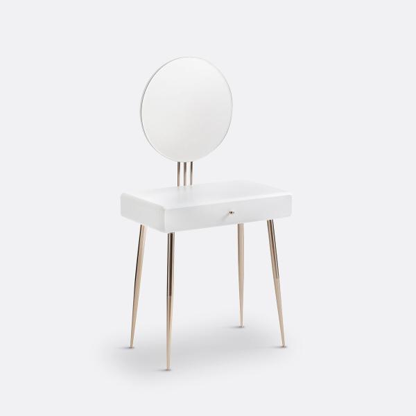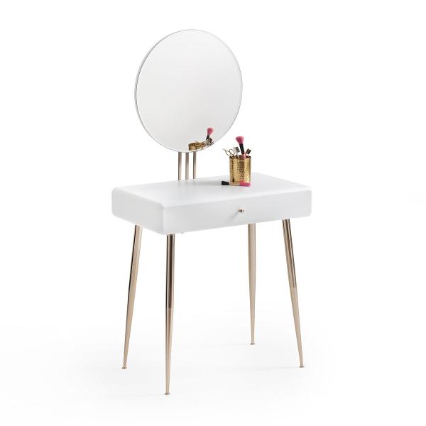 Description de la coiffeuse TOPIM :1 miroir rond1 tiroirPieds fuselés Caractéristiquesde la coiffeuse TOPIM : Caisson MDF laqué finition satinéePieds et poignéebouton en métal aspect laiton Dimensions de la coiffeuse TOPIM :Totales :Largeur : 70 cmProfondeur : 40 cmHauteur : 137,5 cmUtiles :Miroir : Diamètre 50cmTiroir : L63,5 x P31,5 x H6,5 cm