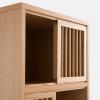- 3 parois coulissantes à barreaux, 1 porte à rainures demi-rondes, piètement et rails en chêne massif teinté noir charbon ou chêne clair, finition vernis nitrocellulosique