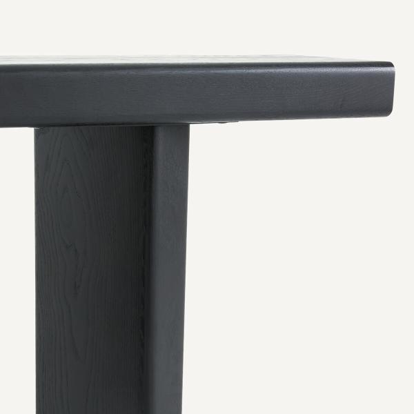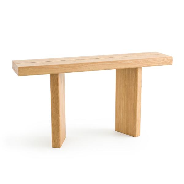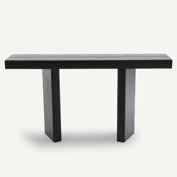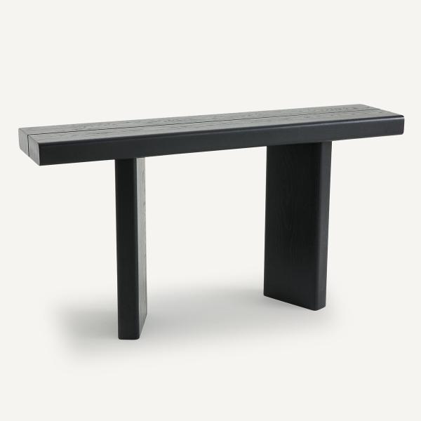 Avec un plateau épais et une structure massive, la console Olaga affirme une identité forte. Son piètement original et son design équilibré en font un meuble d'appoint authentique et élégant.Description