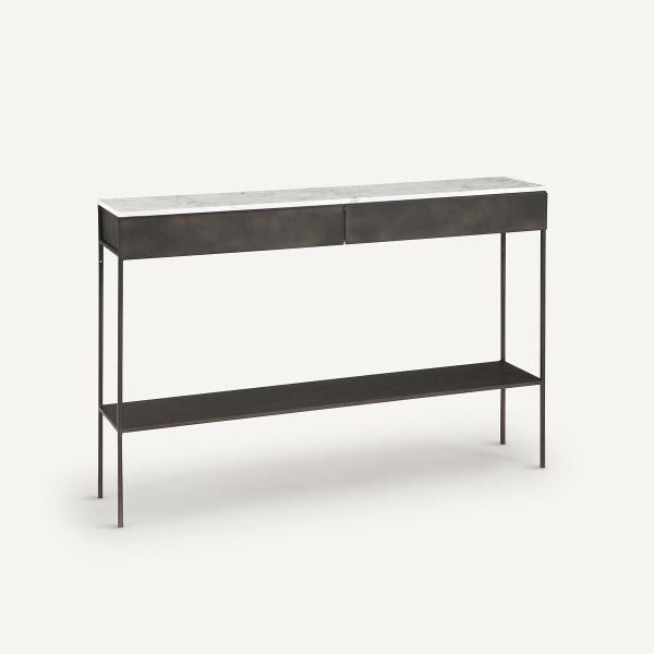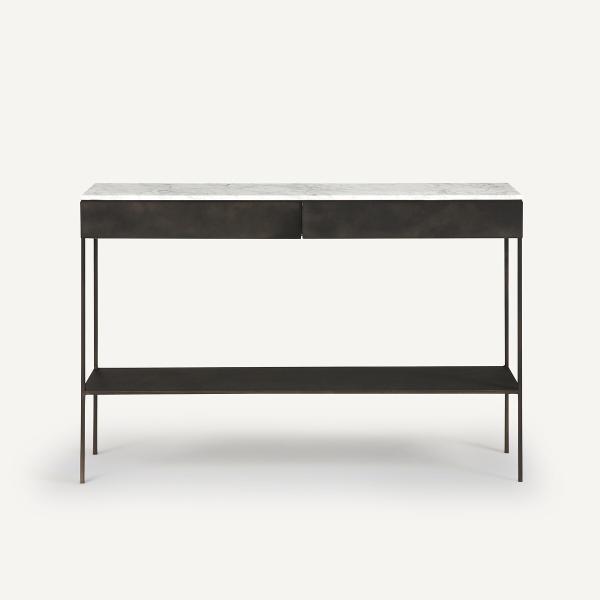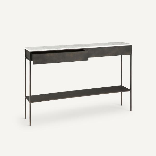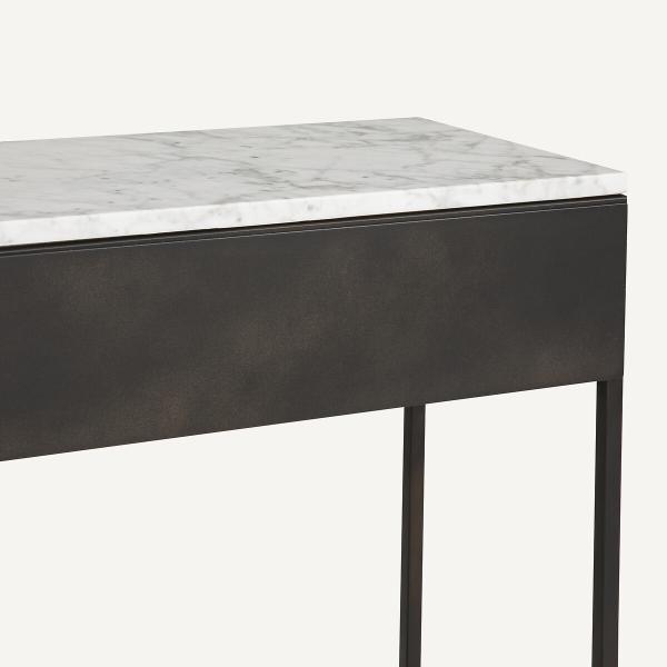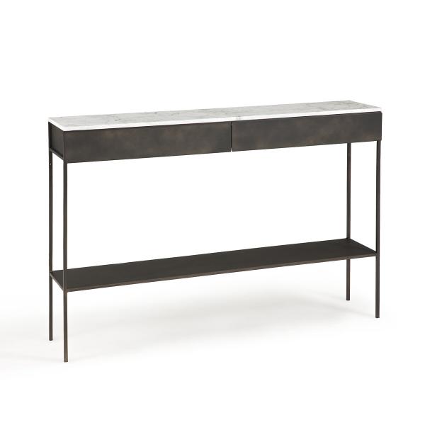 Alliance parfaite du marbre et du métal effet used, la console Fébée est un Iconique AMPM. Une création exclusive ancrée dans l’ADN de la marque.Lignes graphiques et épurées, le plateau en marbre blanc rend chaque pièce unique, des dimensions idéales même dans un petit espace… une console iconique et contemporaine signée AMPM.