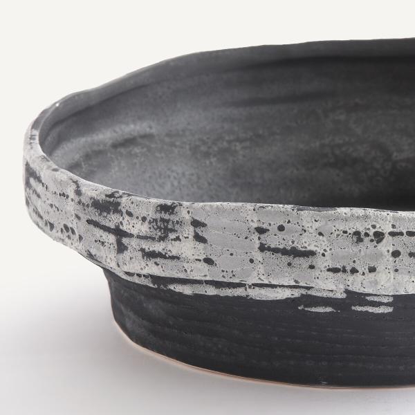 - En céramique mate noire. Un émail blanc mat est appliqué partiellement sur le bord de la coupelle