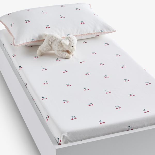 Animé d'un imprimé cerises, le drap-housse en coton biologique Griotte accompagne les rêves les plus gourmands !
