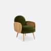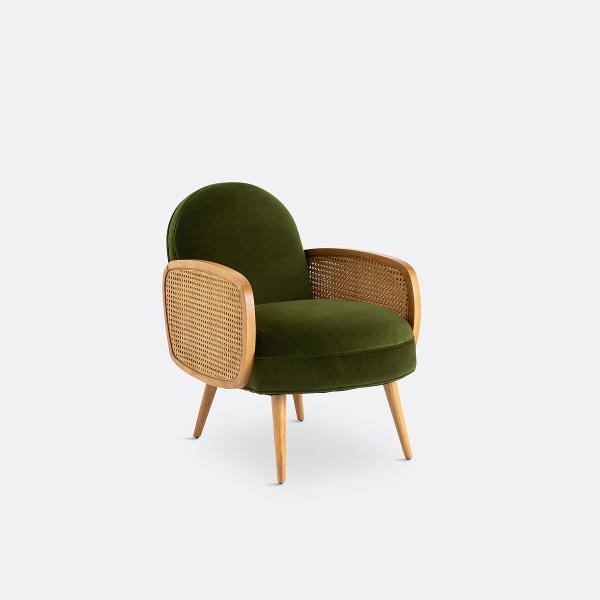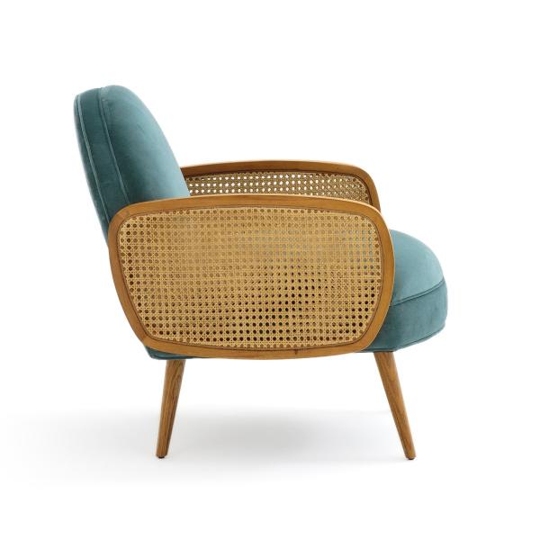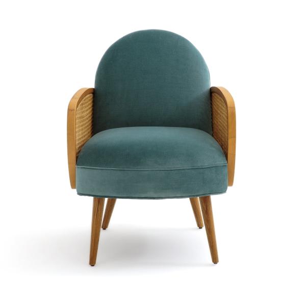 Fauteuil velours et cannage, Buisseau Céladon T. Unique