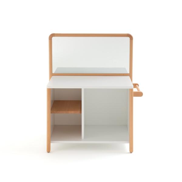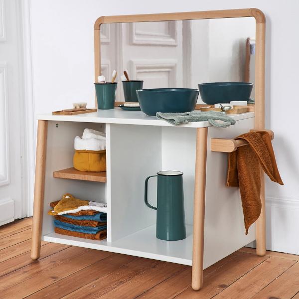 Faire sa toilette pour développer l?estime de soi. Équipé d?une tablette pour rendre accessible tout le nécessaire de toilette, ce meuble recrée l?espace salle de bain à hauteur d?enfant.