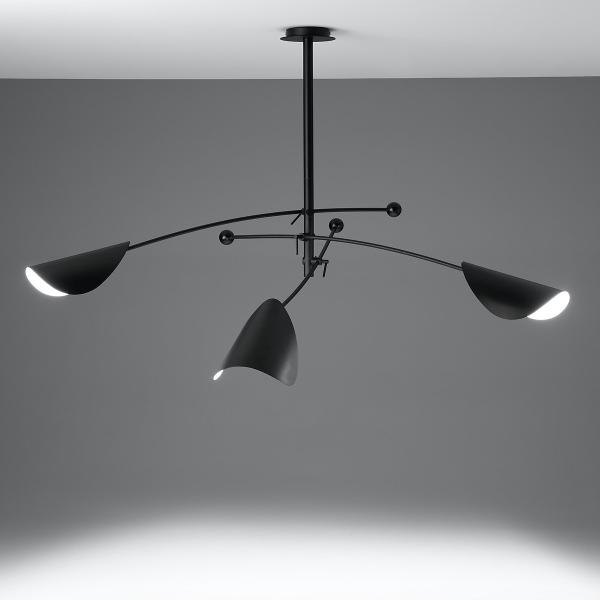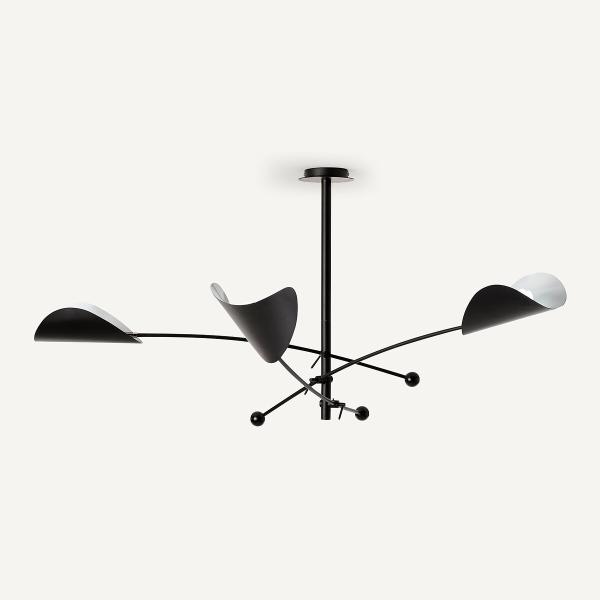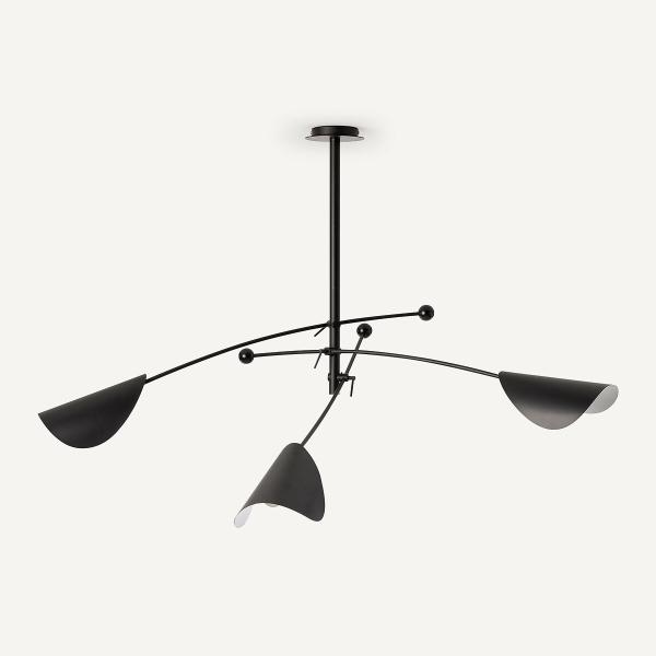 La suspension 3 abat-jours Funambule. Une ligne graphique, légère et aérienne, inspirée des mobiles et de la nature avec ses abat-jour orientables en forme de feuille.