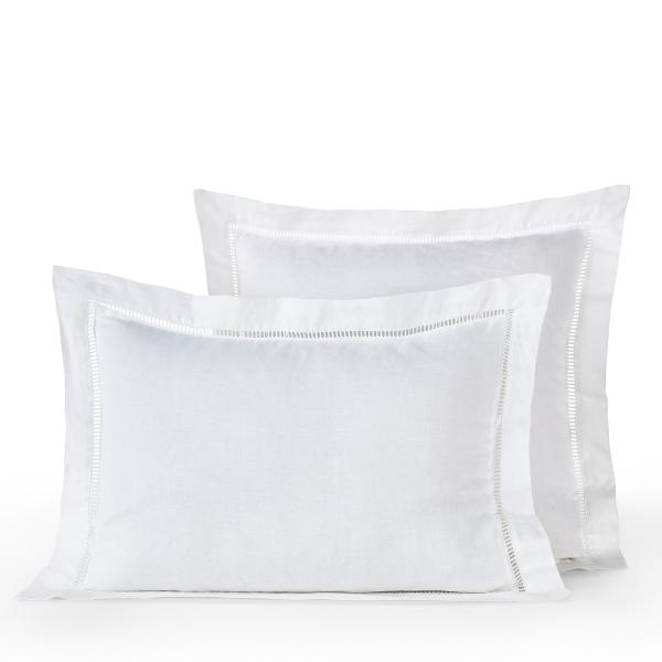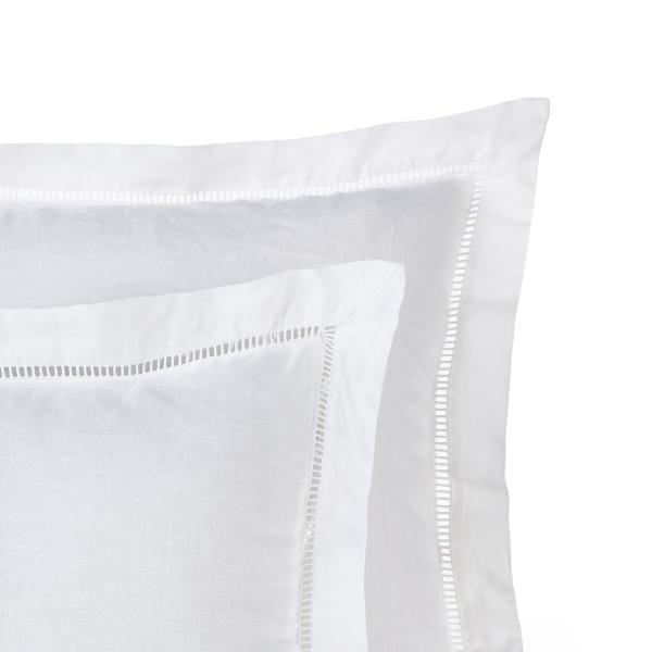 Taie d'oreiller en pur lin lavé immaculé rehaussé d'une délicate finition jour échelle dans l'esprit du beau linge d'autrefois.