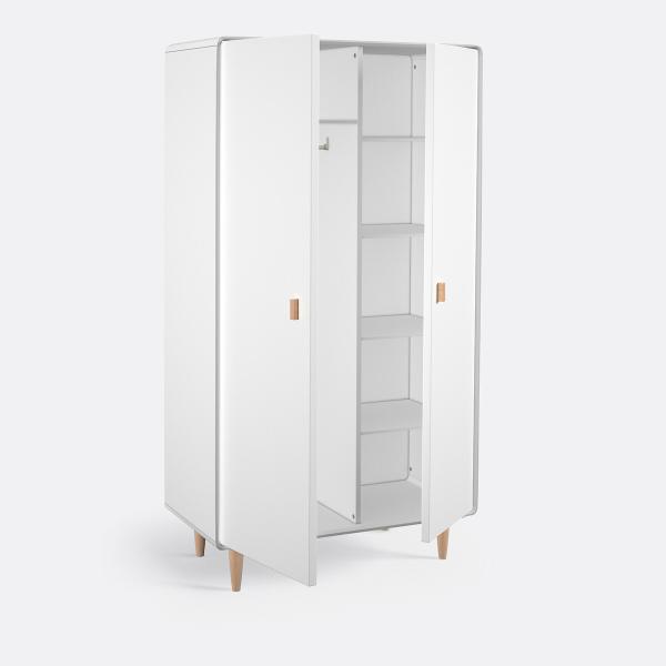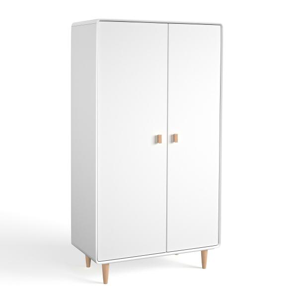 L'armoire 2 portes Jimi suit la tendance scandinave avec son mélange de bois clair et de blanc. Petite note vintage : les pieds fuselés en bouleau.
