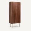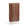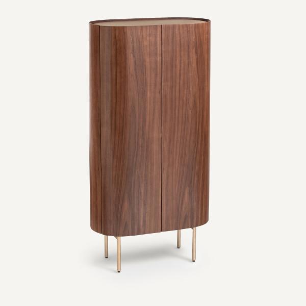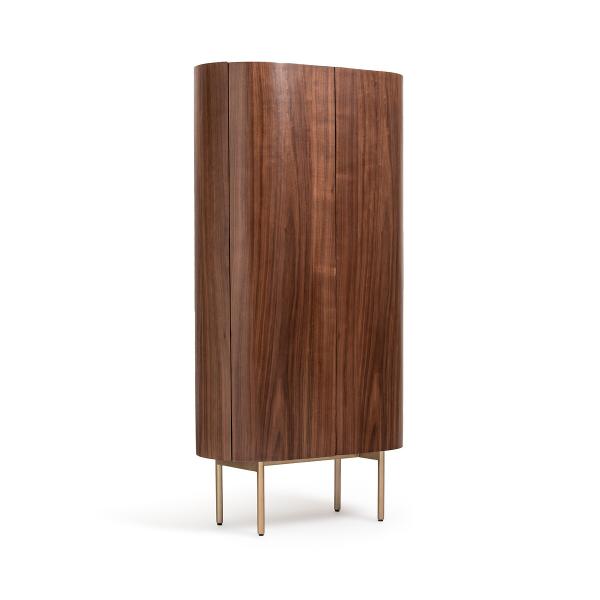 La petite armoire appelée également ''homme-debout'' en noyer et cuir Aslen reprend les codes Art déco avec des courbes qui adoucissent les volumes. Son piètement fin lui confère un côté aérien.