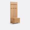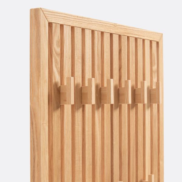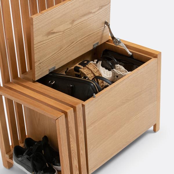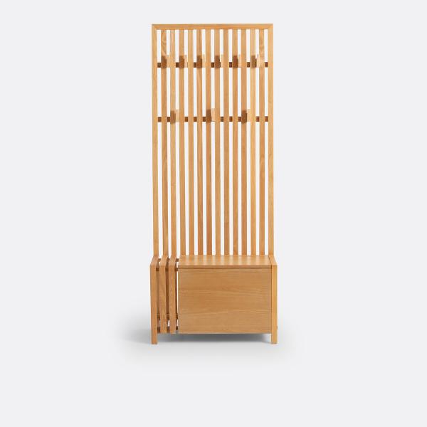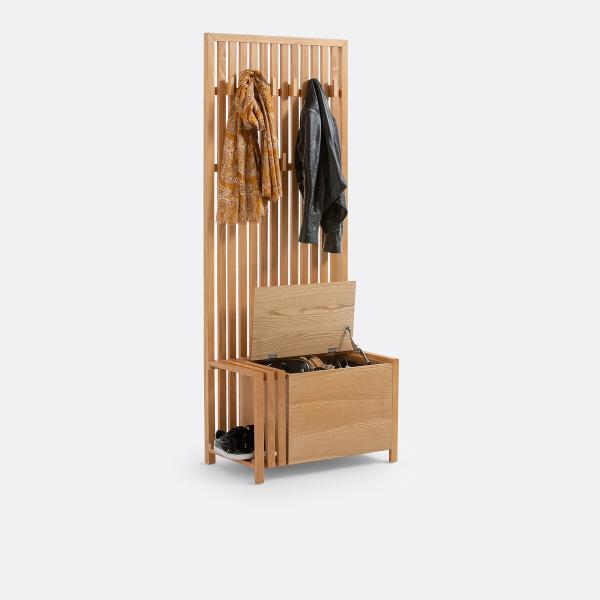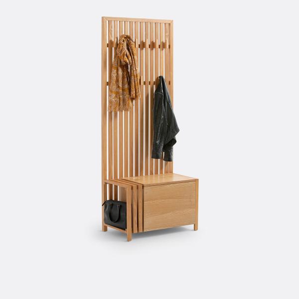 • Banc d'entrée avec coffre de rangement, paroi murale à lattes pouvant servir de séparateur de pièce, avec 9 patères amovibles à répartir sur 2 rangées.