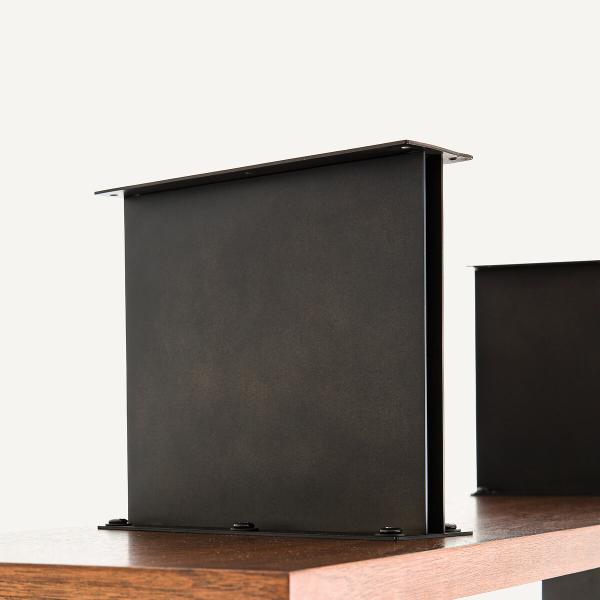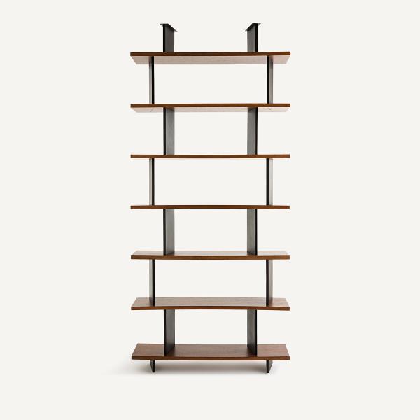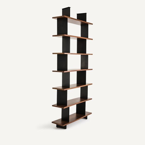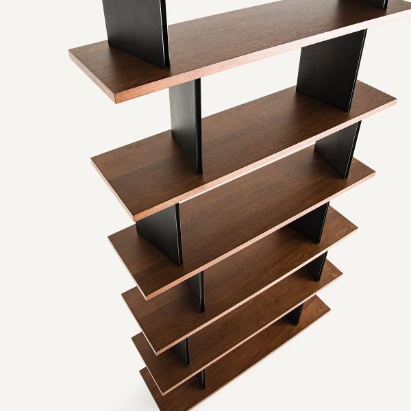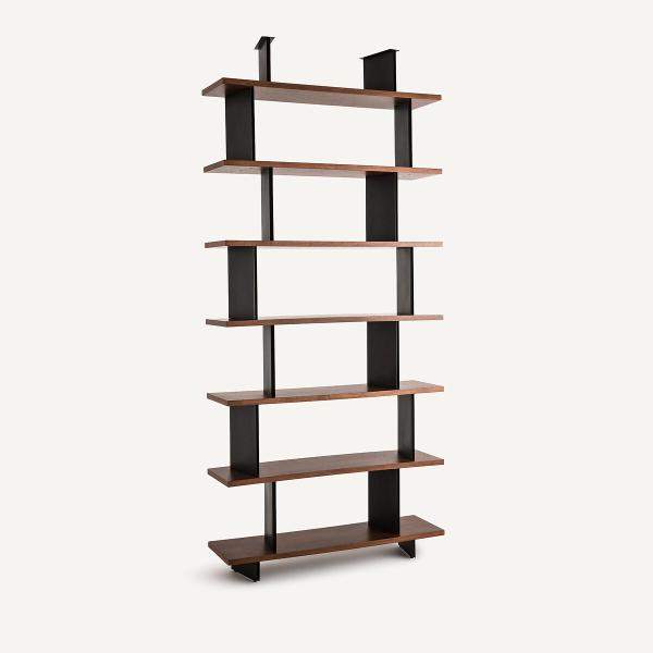 Sculpturale et modulable, Laos est une unité de bibliothèque qui se prête à de nombreuses compositions. En configuration linéaire le long d’un mur, les bibliothèques en accumulation forment un tableau mural.Placées au centre d’une pièce, elles agissent comme une séparation légère entre les espaces, laissant passer la lumière. Positionnées dans un angle, elles créent un coin intime, plus cosy. Les éléments verticaux en métal apportent une rupture à la linéarité des étagères noyer. Un design interne signé AMPM.