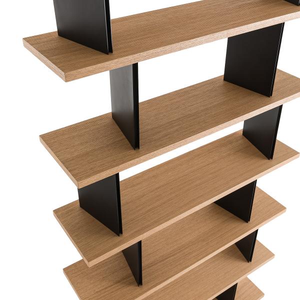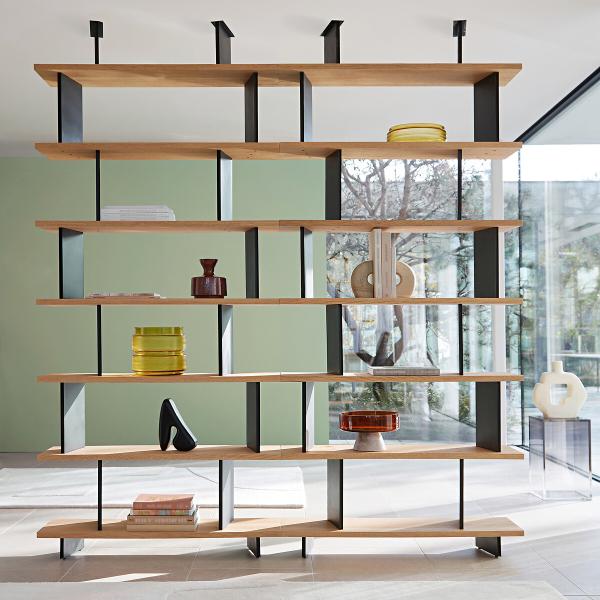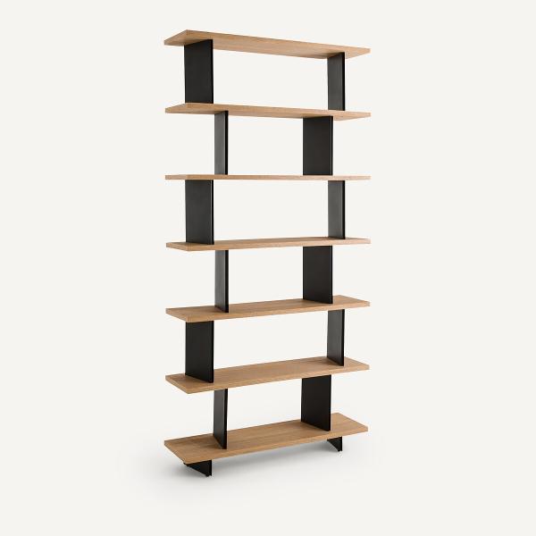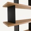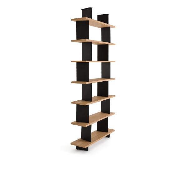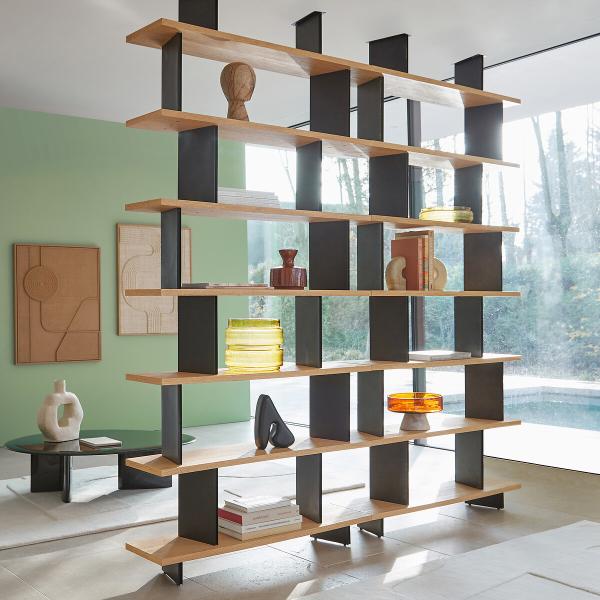 Sculpturale et modulable, Laos est une unité de bibliothèque qui se prête à de nombreuses compositions. En configuration linéaire le long d’un mur, les bibliothèques en accumulation forment un tableau mural.Placées au centre d’une pièce, elles agissent comme une séparation légère entre les espaces, laissant passer la lumière. Positionnées dans un angle, elles créent un coin intime, plus cosy. Les éléments verticaux en métal apportent une rupture à la linéarité des étagères en chêne sablé. Un design interne signé AMPM.