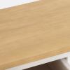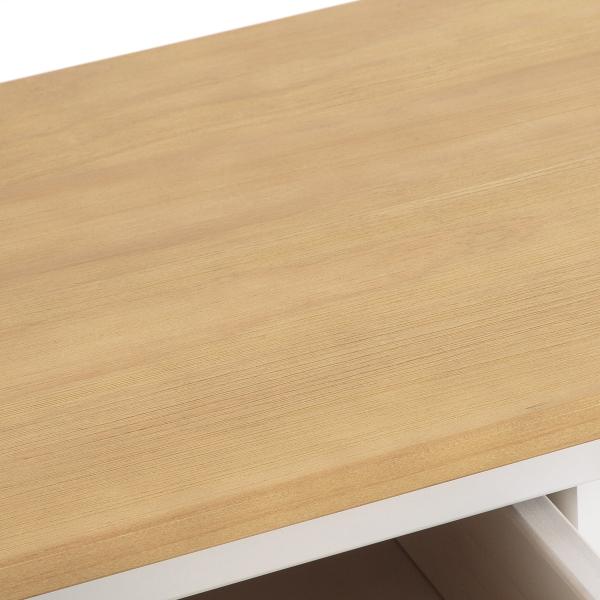- Dessus et dessous en pin massif légèrement brossé, teinté chêne, finition vernis acrylique. Caisson et tablette en pin massif, peinture blanche, finition acrylique.