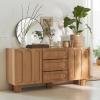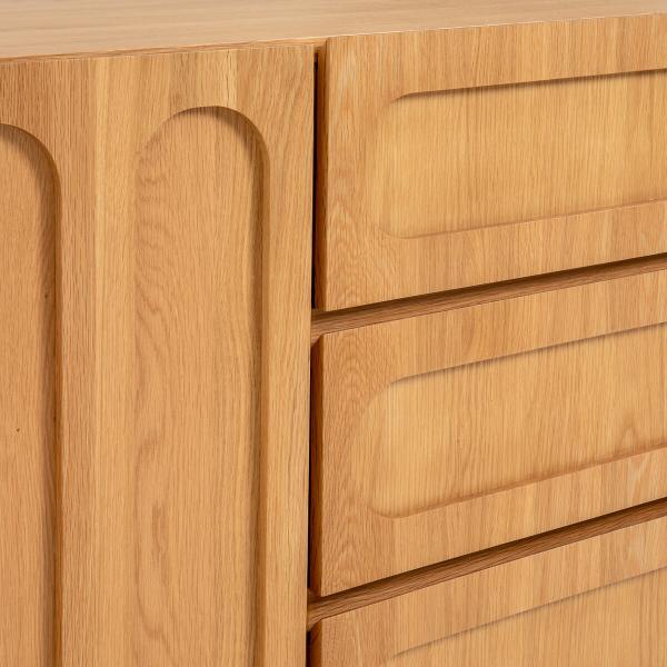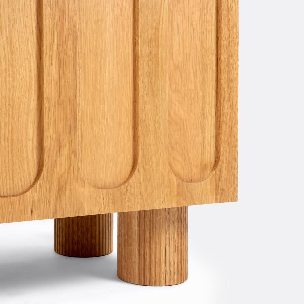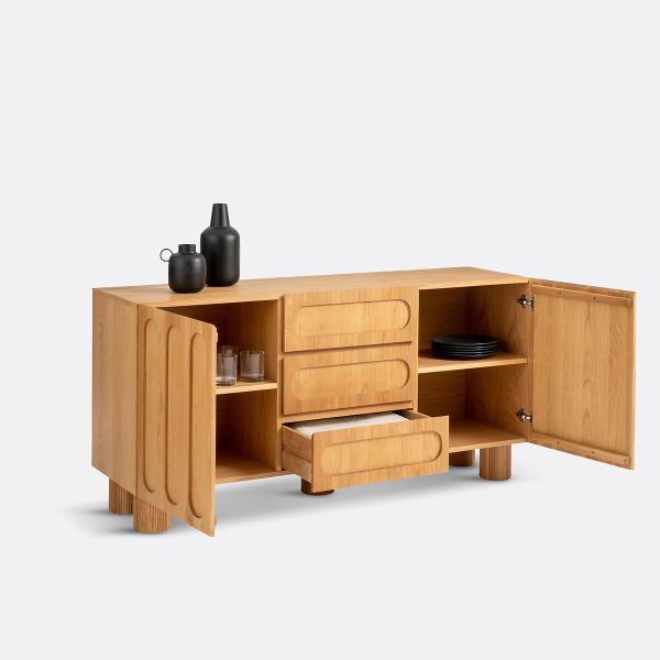 Façades chêne en relief, pieds cannelés, dimensions généreuses. Le buffet Cannelo offre de multiples espaces de rangement pour votre vaisselle, vos couverts et votre linge de table. La future pièce maîtresse de votre séjour.