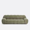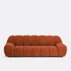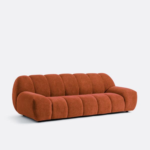 ""Le canapé Nuria s’inspire des codes emblématiques des années 70 avec son assise basse posée à même le sol et son allure généreusement moelleuse. Un jeu de coutures dessine une alternance de volumes rebondis et de courbes, évoquant un effet de boudins, qui rappelle l’esthétique enveloppante et le confort douillet des intérieurs seventies.""