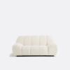 ""Le canapé Nuria s’inspire des codes emblématiques des années 70 avec son assise basse posée à même le sol et son allure généreusement moelleuse. Un jeu de coutures dessine une alternance de volumes rebondis et de courbes, évoquant un effet de boudins, qui rappelle l’esthétique enveloppante et le confort douillet des intérieurs seventies.""