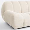 ""Le canapé Nuria s’inspire des codes emblématiques des années 70 avec son assise basse posée à même le sol et son allure généreusement moelleuse. Un jeu de coutures dessine une alternance de volumes rebondis et de courbes, évoquant un effet de boudins, qui rappelle l’esthétique enveloppante et le confort douillet des intérieurs seventies.""