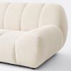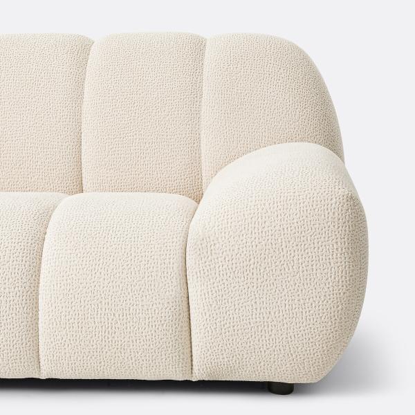 ""Le canapé Nuria s’inspire des codes emblématiques des années 70 avec son assise basse posée à même le sol et son allure généreusement moelleuse. Un jeu de coutures dessine une alternance de volumes rebondis et de courbes, évoquant un effet de boudins, qui rappelle l’esthétique enveloppante et le confort douillet des intérieurs seventies.""