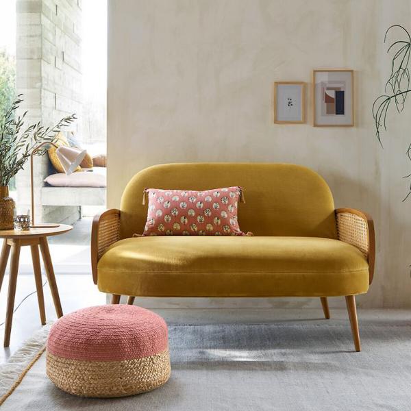 Canapé velours et cannage, Buisseau Jaune moutarde 2P