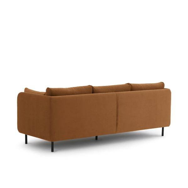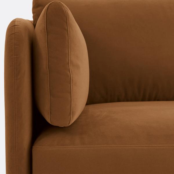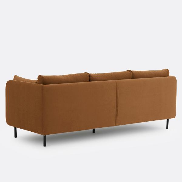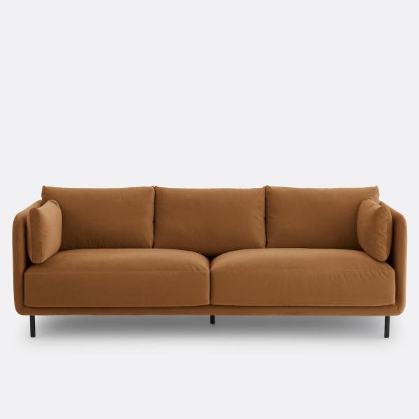 Hyper confortable, ce canapé aux lignes contemporaines associe une structure fine et des pieds en métal à une assise super moelleuse avec de gros coussins accueillants et un revêtement velours. Fabrication française.