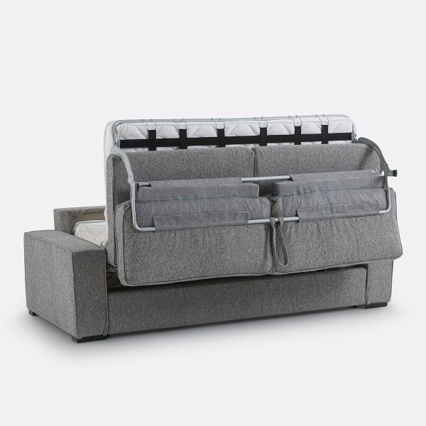 Grâce au système couchage express, le canapé lit se déplie en un clin d'œil (à l'aide d'une petite poignée derrière les coussins de dossier), sans effort et sans enlever les coussins.