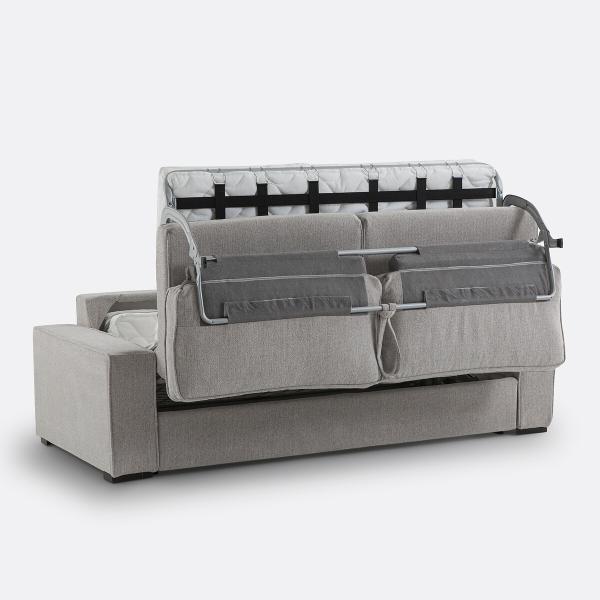 Grâce au système couchage express, le canapé lit se déplie en un clin d'œil (à l'aide d'une petite poignée derrière les coussins de dossier), sans effort et sans enlever les coussins.
