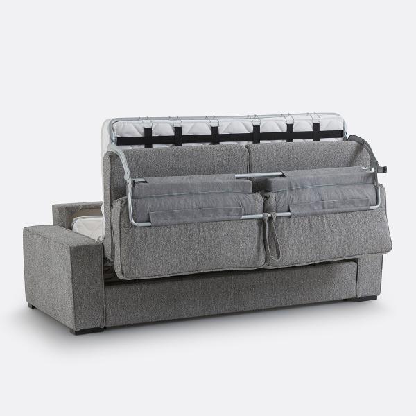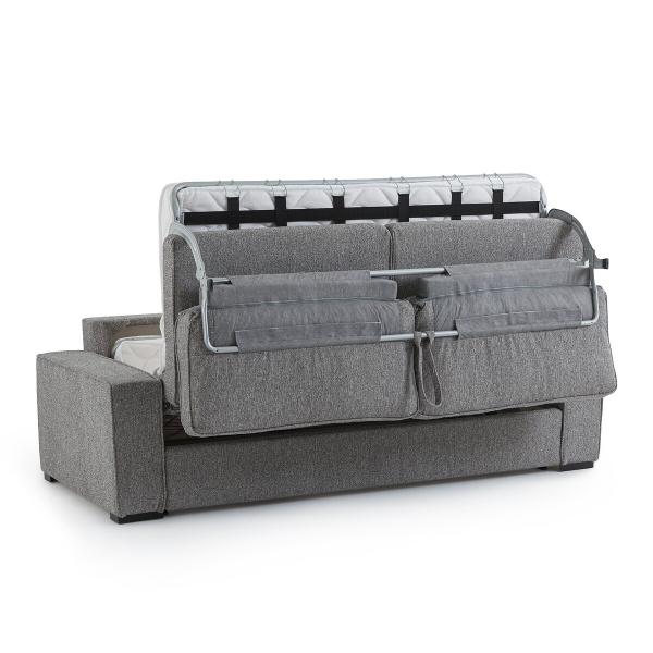Grâce au système couchage express, le canapé lit se déplie en un clin d'œil (à l'aide d'une petite poignée derrière les coussins de dossier), sans effort et sans enlever les coussins.