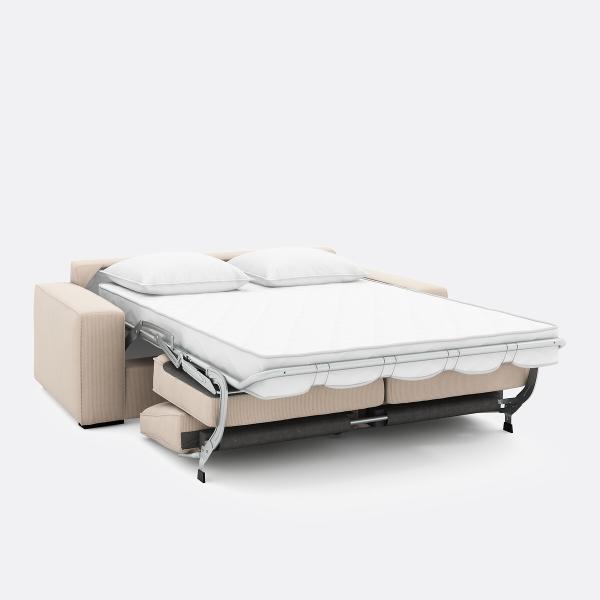 Grâce au système couchage express, le canapé lit se déplie en un clin d'œil (à l'aide d'une petite poignée derrière les coussins de dossier), sans effort et sans enlever les coussins.