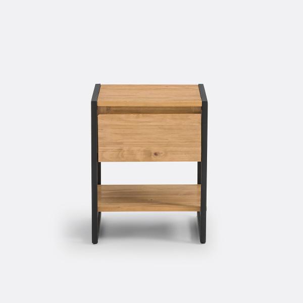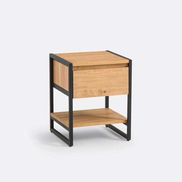 Le chevet Hiba. Pile dans l'esprit industriel, le chevet Hiba est aussi pratique que tendance, avec son tiroir et sa tablette. A associer aux autres meubles de la gamme Hiba.