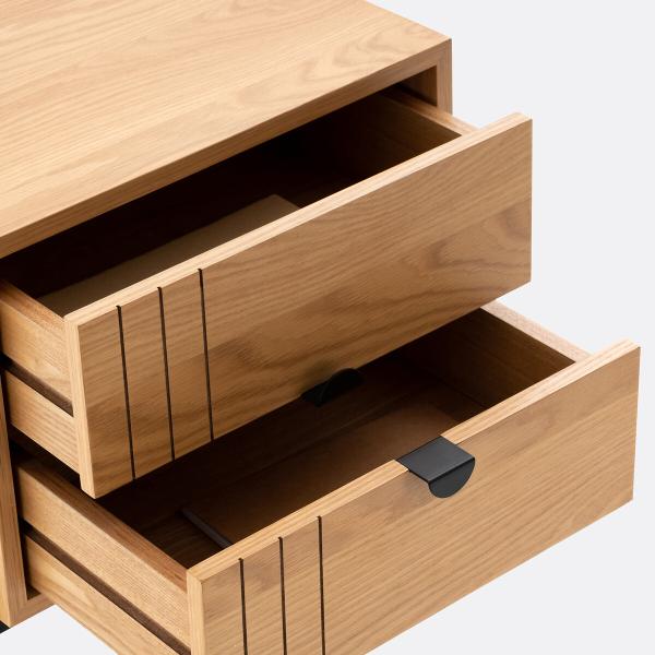 - Caisson en MDF plaqué chêne finition nitrocellulosique avec stries décoratives sur les façades de tiroirs