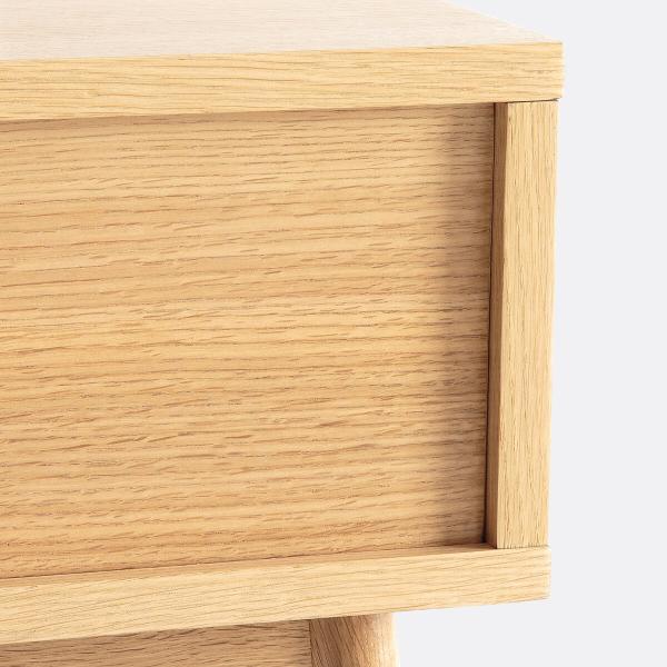 - Chêne massif et MDF plaqué chêne, finition vernis nitrocellulosique.