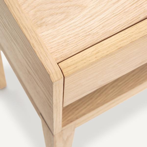 Un chevet où le superflu n?a pas sa place. Mono matière, simplicité et finesse sont les principales caractéristiques de cette pièce. Le piètement haut et délicat, en référence aux commodes sauteuses, crée une collection élancée qui s?intègre naturellement dans nos intérieurs.