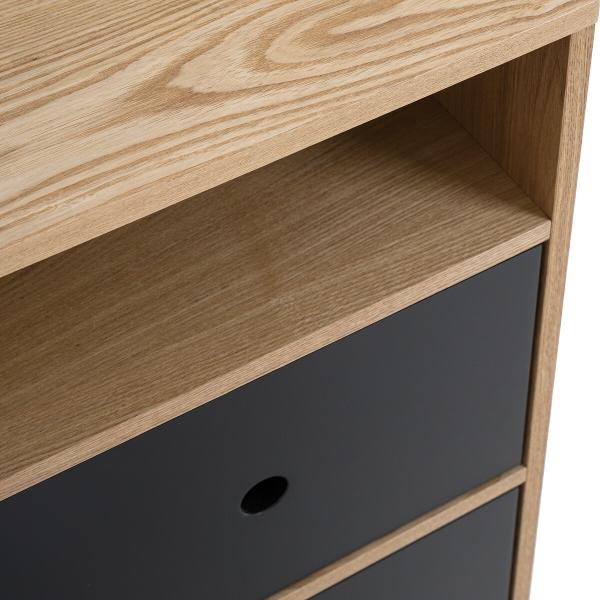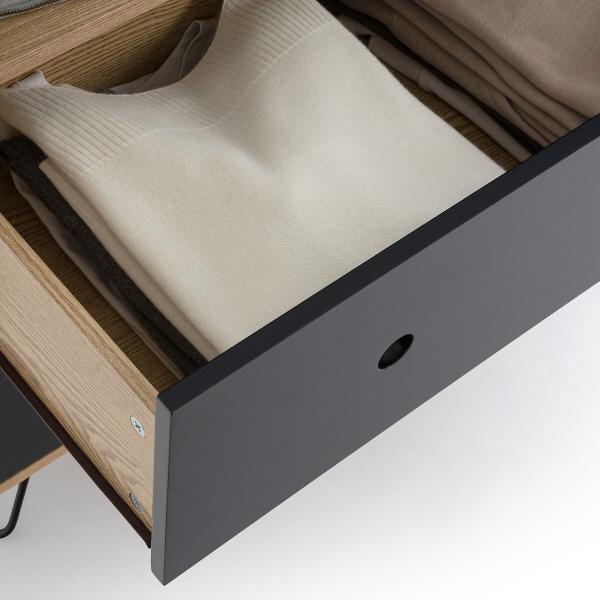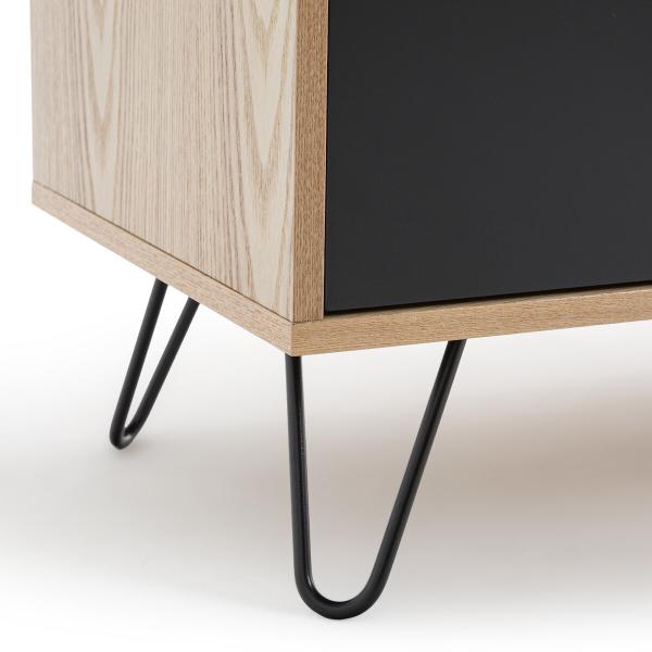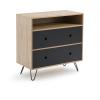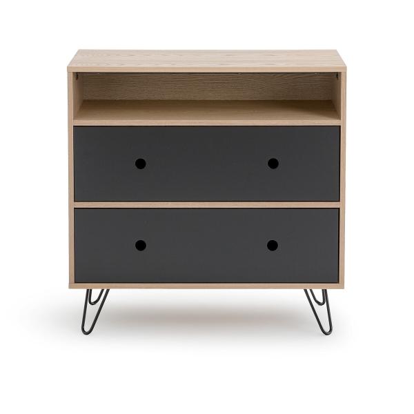 Design contemporain, ligne épurée : la commode Cleon associe bois clair et piètement en métal style industriel. Elle offre deux tiroirs et une niche pour ranger vos livres et effets personnels. Déco et fonctionnelle.Description