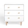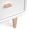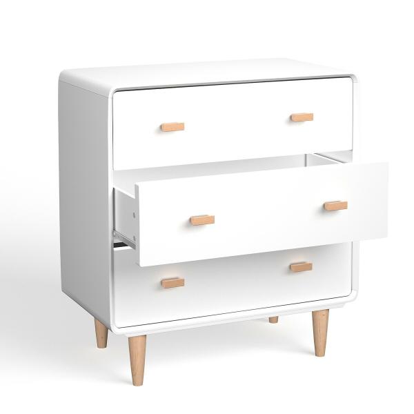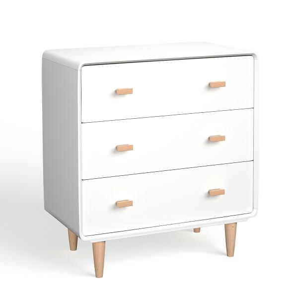 La commode 3 tiroirs Jimi suit la tendance scandinave avec son mélange de bois clair et de blanc. Petite note vintage : les pieds fuselés en bouleau.
