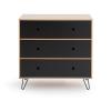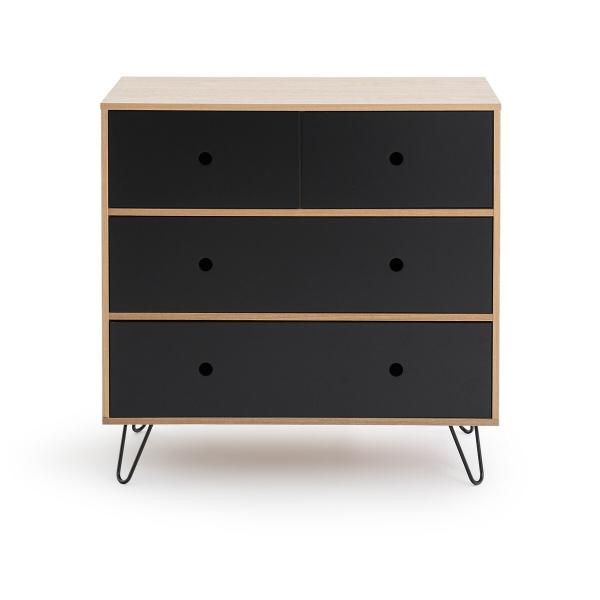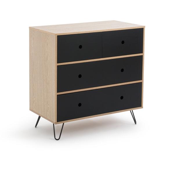 Design contemporain, ligne épurée : la commode Cleon associe bois clair et piètement en métal. Elle offre quatre tiroirs pour vos effets personnels. Déco et fonctionnelle.Description