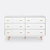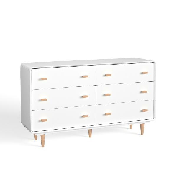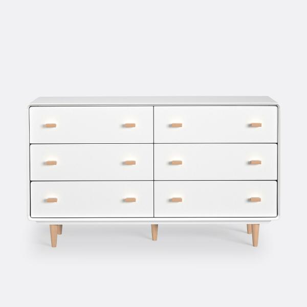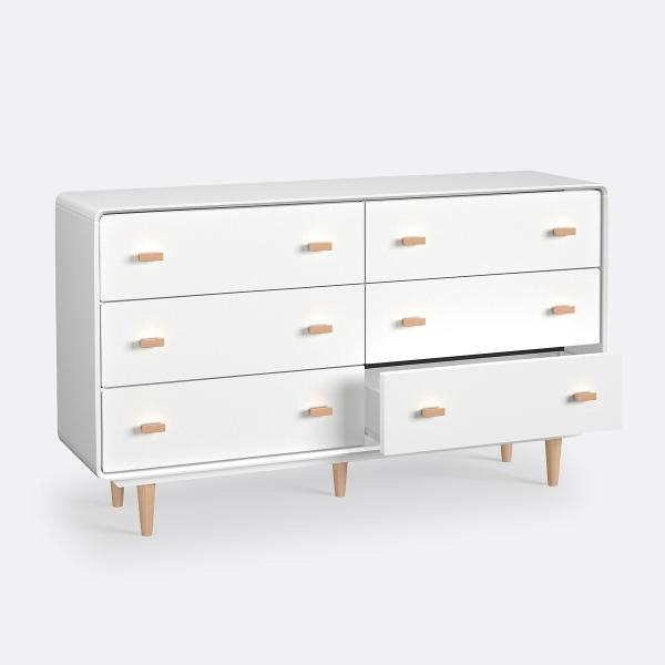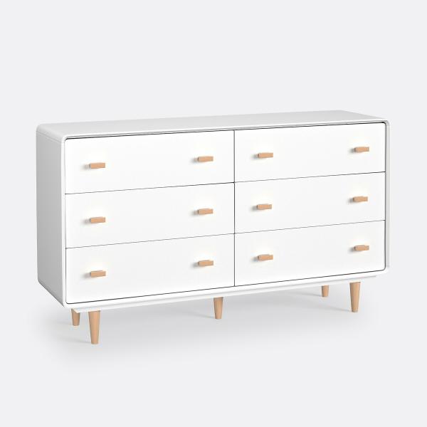 La commode 6 tiroirs Jimi suit la tendance scandinave avec son mélange de bois clair et de blanc. La petite note vintage réside dans ses pieds fuselés en bouleau.