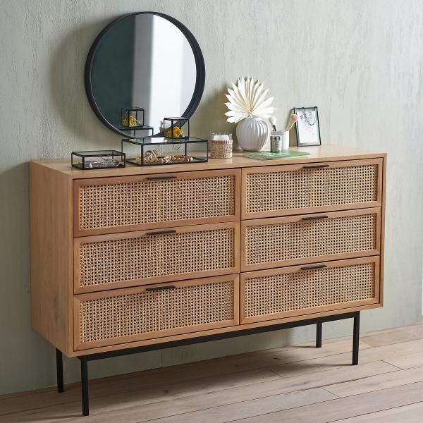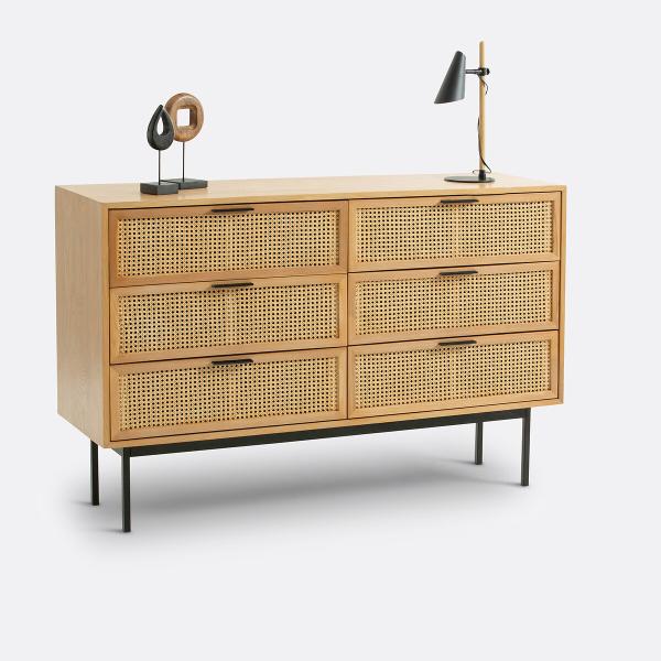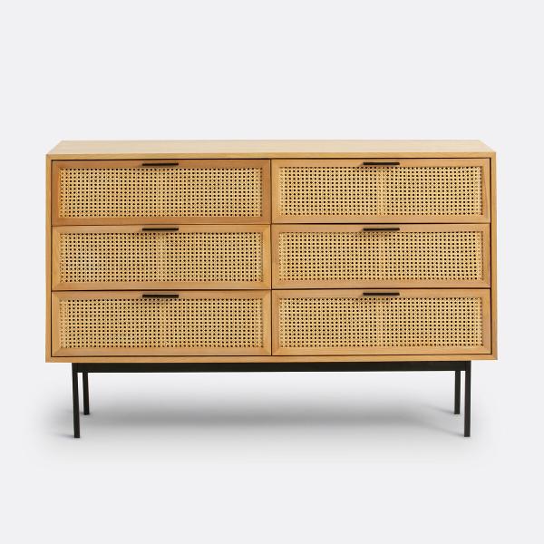 Avec ses tiroirs habillés d?un cannage en rotin, la commode Waska se distingue par ses lignes pures bien ancrées dans la tendance vintage du moment. Raffinée et élégante, c?est une pièce à métisser pour donner du caractère à votre intérieur.